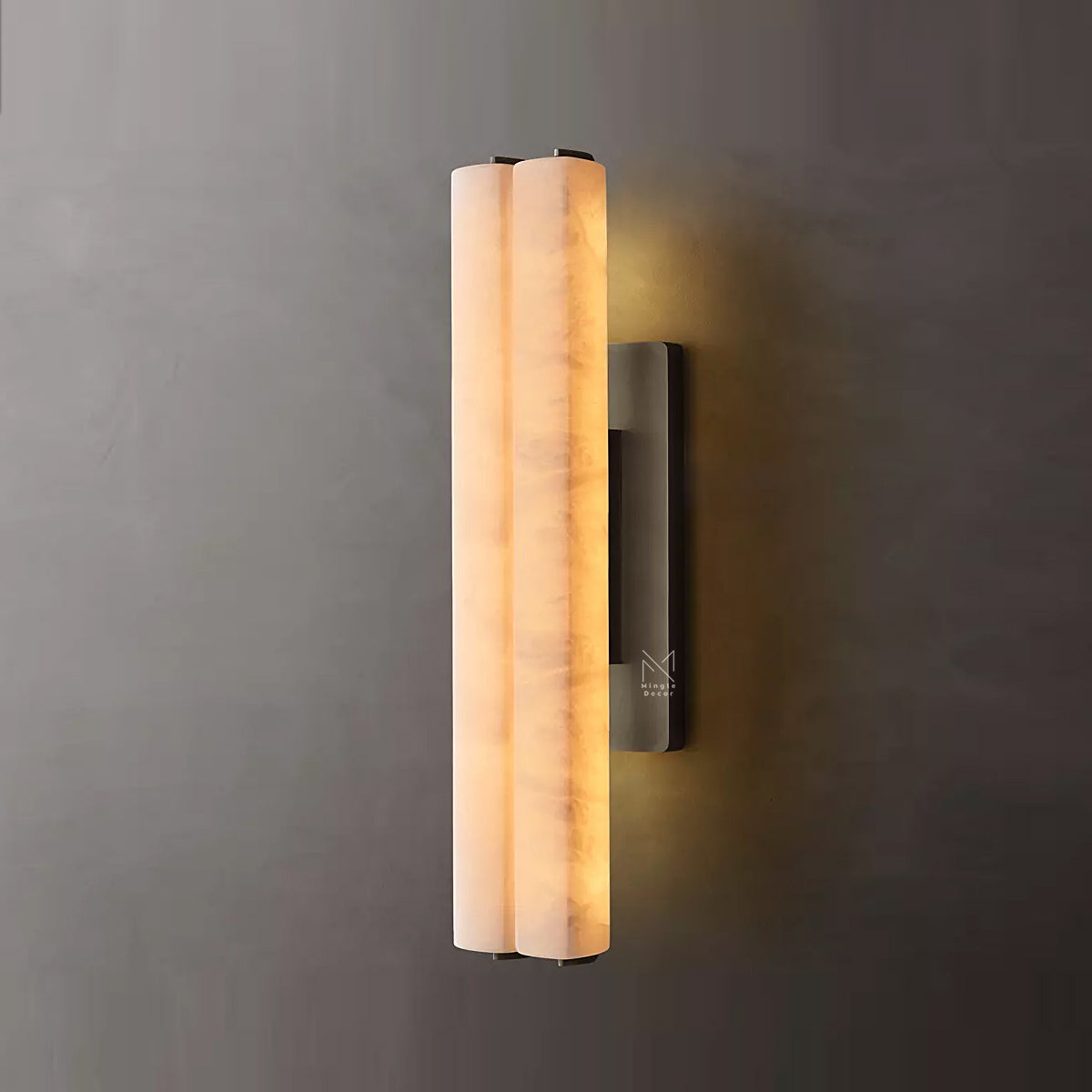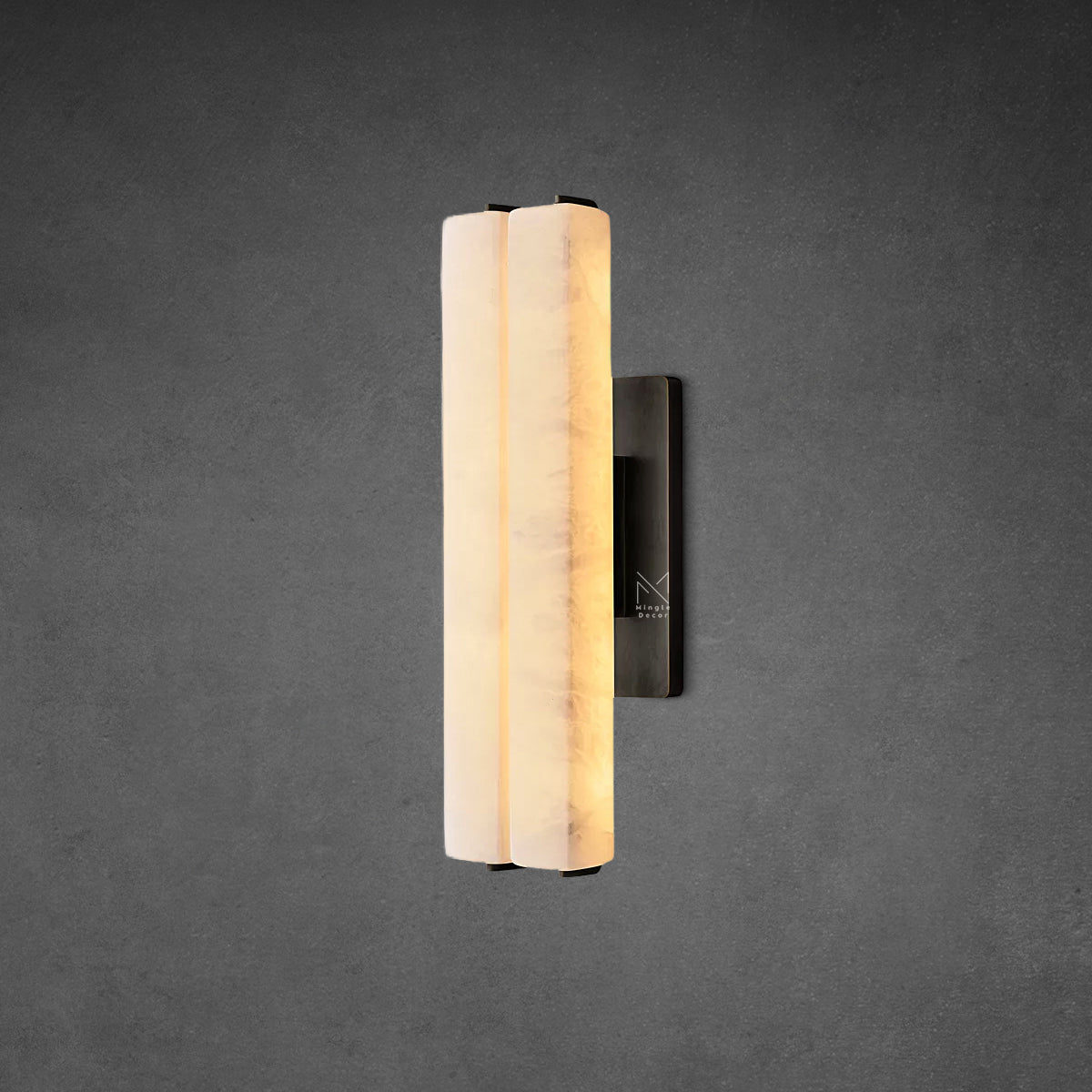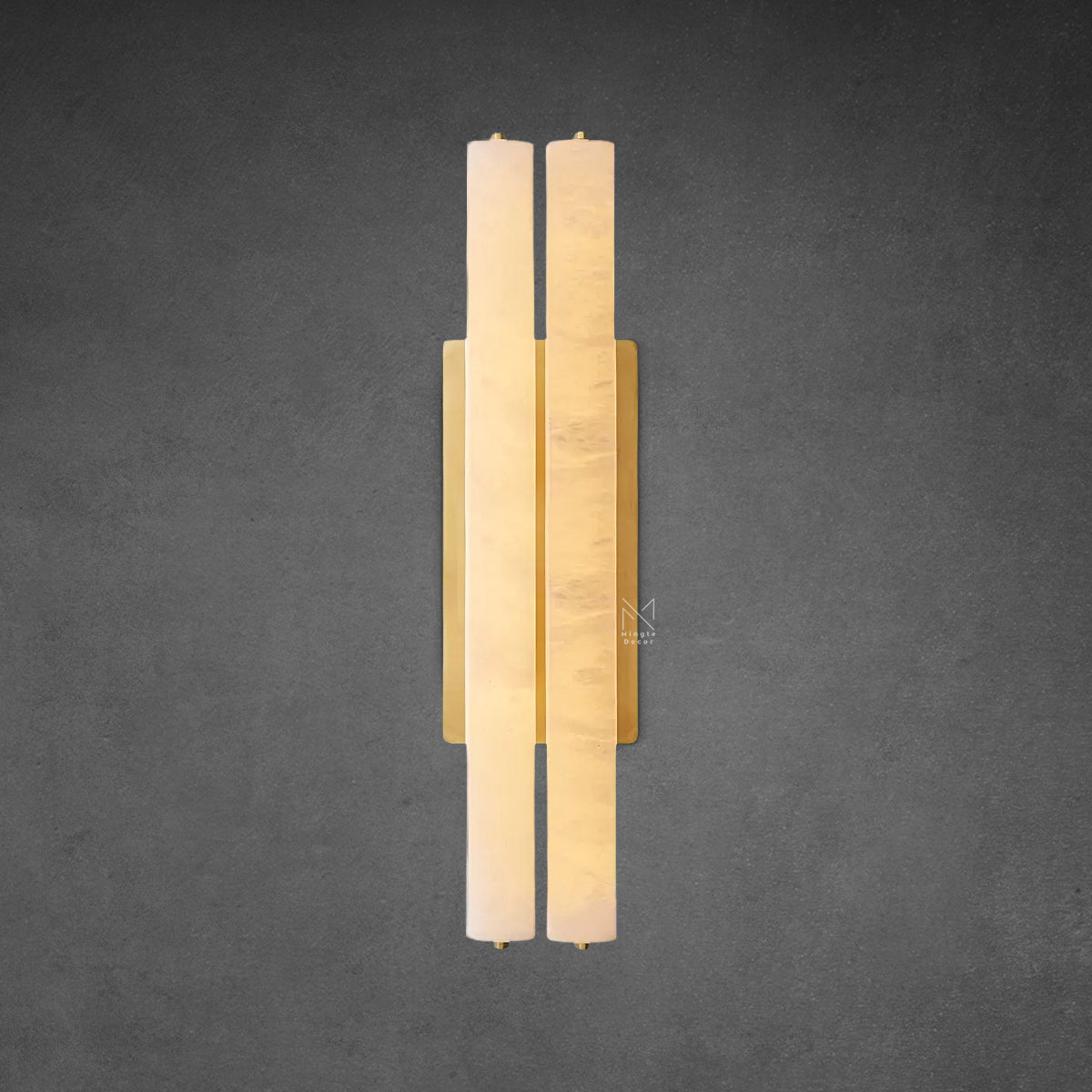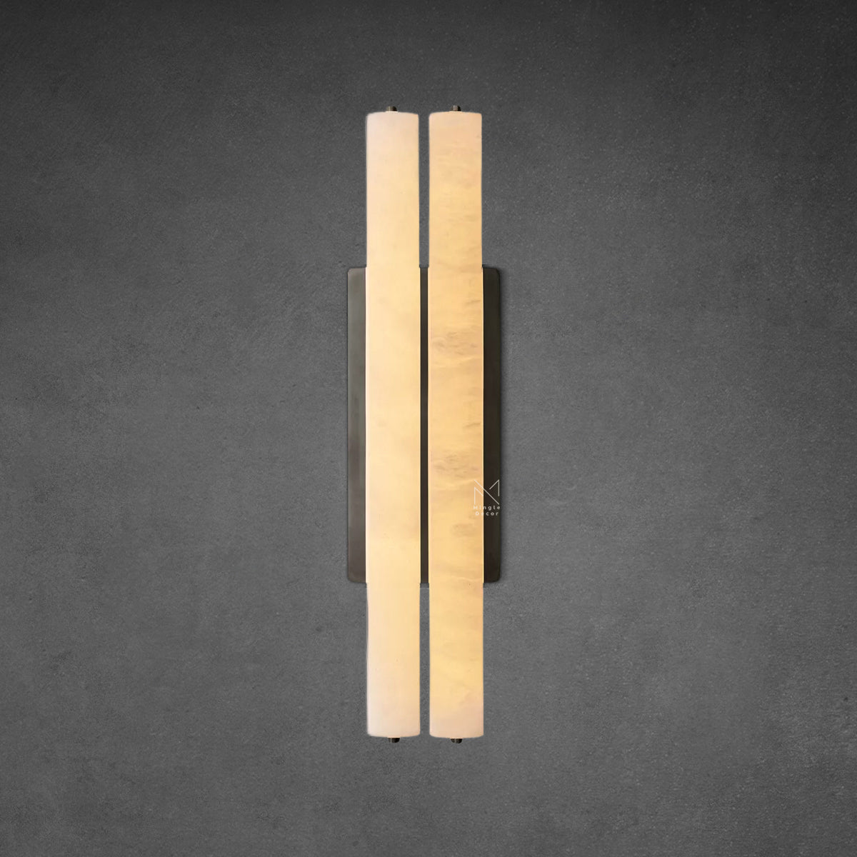 Audubon captures the spirit of 1960s Italian minimalism, featuring two prisms of alabaster mounted on a solid brass frame. The collection is both striking and restrained, evoking the warmth of candlelight through elongated LEDs that cast beautiful light through the translucent stone.