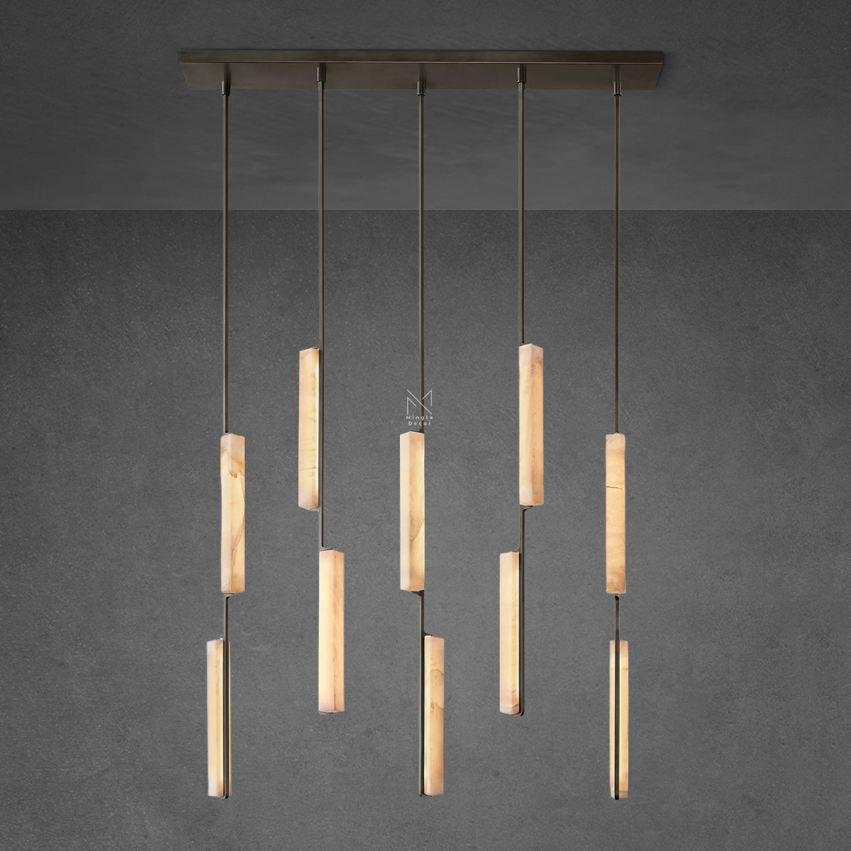 Audubon captures the spirit of 1960s Italian minimalism, appearing to cascade from above with ten prisms of alabaster suspended from vertical brass drops. The collection is both striking and restrained, evoking the warmth of candlelight through elongated LEDs that cast beautiful light through the translucent stone.