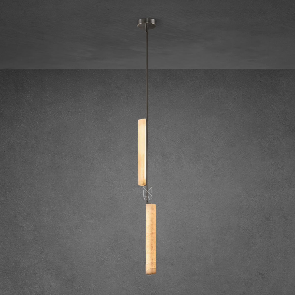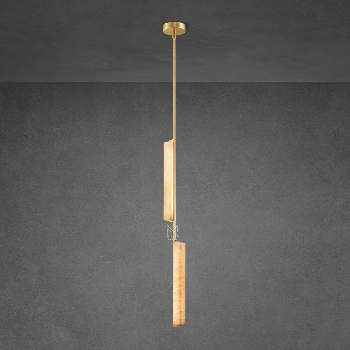 Audubon captures the spirit of 1960s Italian minimalism, featuring two prisms of alabaster suspended from a vertical brass drop. The collection by Joseph Jeup is both striking and restrained, evoking the warmth of candlelight through elongated LEDs that cast beautiful light through the translucent stone.