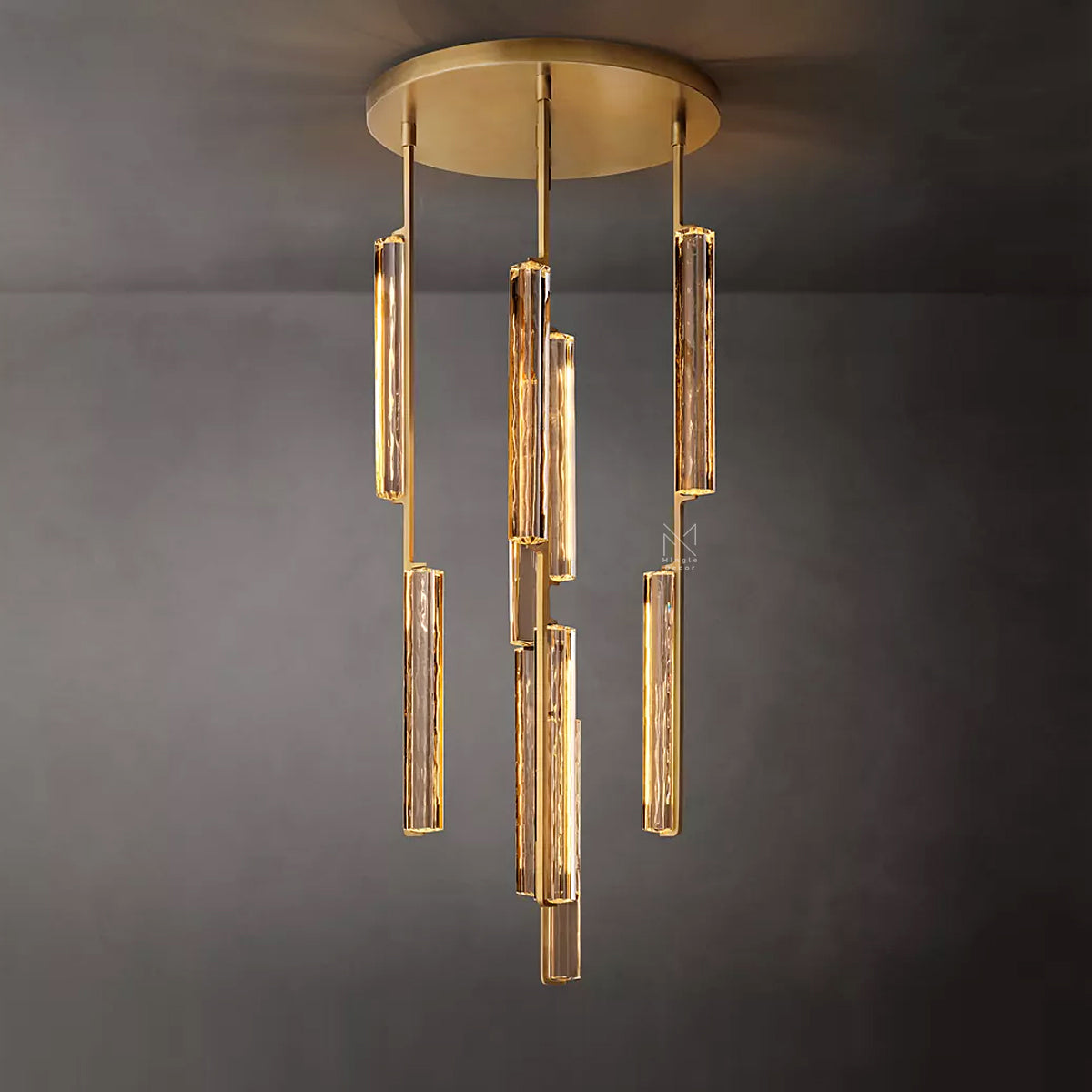 Capturing the spirit of 1960s Italian minimalism, Audubon appears to cascade from above with ten prisms of hand-polished K9 crystal on vertical brass drops. At once striking and restrained, the collection is the warmth of candlelight with elongated LEDs that shed beautiful light through the undulating texture of the glass.