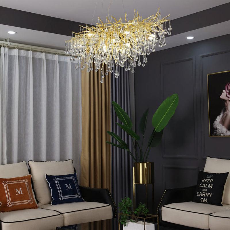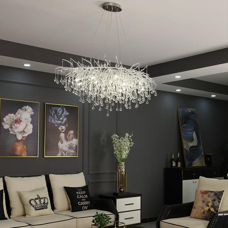 Exquisite Workmanship, The surface of the aluminum metal through a fine frosted treatment, make this long chandelier more rich texture and advanced sense, elegant details instantly let people indulge. The clear crystal raindrop are shining when the chandelier light up.
