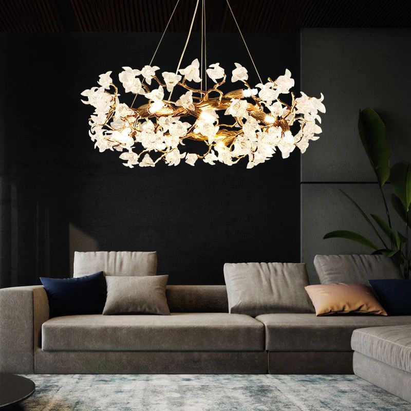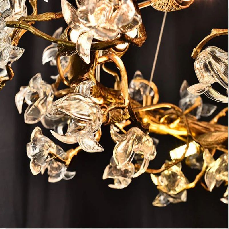 Bring elegance, femininity, and grace to your living space with Tammy. This stunning orchid chandelier is held together by a circular copper branch, meticulously misshapen and displaying intricate details to resemble authentic wood. It is adorned with delicate orchid flowers that bloom when lit up, each one consisting of crystal petals that refract the light to create a breathtaking, almost ethereal, effect. Suspend this piece of statement lighting in any room that would benefit from a bright and natural feel.