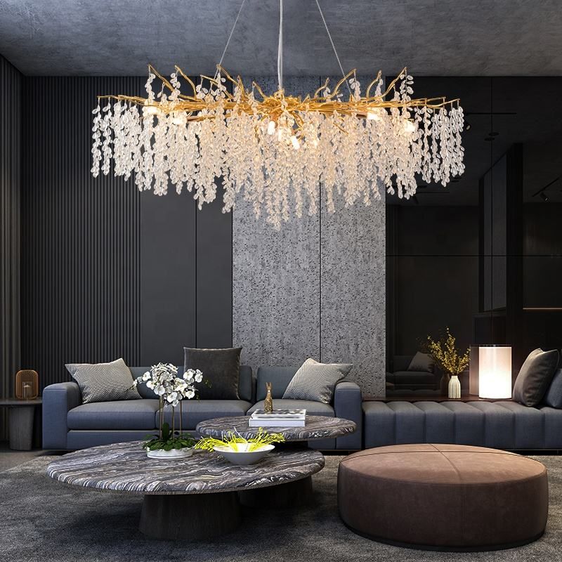 Impress your guests with the Vincy chandelier; show-stopping statement lighting that brings wonder and warmth to larger living spaces. A striking work of art, it recreates the natural beauty of the wisteria plant—consisting of cascading crystal petals that glisten under the glow of the bulbs. Finished in gold for a luxurious touch, the aluminum branches provide a sturdy foundation for this structure.